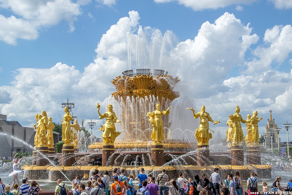 Возможно, название и не совсем корректно - все-таки это фонтан, расположенный на ВДНХ призван был символизировать дружбу народов великого СССР. Но фонтан находится на территории России, и ею поддерживается, а в этом году и полностью реставрирован. Вот этот и реставрированный фонтан, занимающий центральное место среди фонтанов Выставки, я и решил посмотреть, тем более, что самый первый день лета выдался очень теплым и солнечным. 1. Итак, вот он - общий вид фонтана и шестнадцати девушек-республик. Да именно 16. Как-то у большинства людей в памяти осталось, что республик было 15, и в позднем СССР это было именно так. Но фонтан построили в 1954 году, а до 1956 года существовала отдельная Карело-Финская ССР, ставшая впоследствии автономной республикой в составе РСФСР (Российской советской федеративной социалистической республики). Кстати, вот именно в центре, со снопом в руке - это Россия, а слева и справа ее две славянские сестры - Украина и Белоруссия (тогда называли так, а не как сейчас