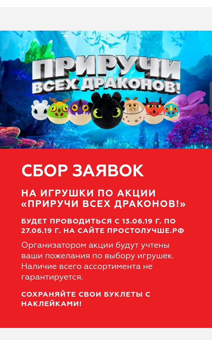 Не беда. У вас есть два пути... Если Вы желаете получить заветную мягкую игрушку. То можете подать заявку на сайте простолучше.рф и через некоторое время их доставят в магазин специально для Вас. А еще имея на руках полностью заполненный буклет по акции "Собери всех драконов", Вы можете получить одну из сквород по новой акции "Royal Kuhen". Но торопитесь эта возможно только до 12 июня! Не пожалейте лайка если статья была полезна, это бесплатно))