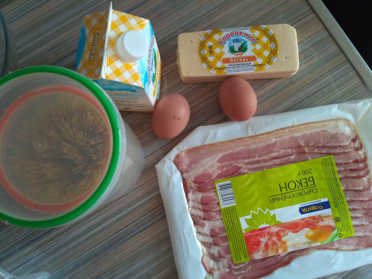 Всем привет. Сегодня мы с вами приготовим простую карбонару дома, которая настолько сытная, что можно наесться одной порцией. Нам понадобится: 1) 2 желтка яиц (можно и больше, все зависит от ваших предпочтений); 2) бекон (берите в Ленте или Ашане по акции, бекон нынче дорого стоит); 3) 100 грамм дешевого сыра (можно добавлять больше или меньше); 4) сливки (у тех, что использую я, жирность составляет 10%, для карбонары было потрачено около одной кружки сливок); 5) спагетти. Ставим кастрюлю с водой. Режем бекон на аккуратные не очень маленькие кусочки, кладем в сковородку и вытапливаем жир, слегка обжаривая мясо; добавляем чеснок или травы, если они у вас есть, оставляем сковороду в сторонке. Отделяем желтки от белков, смешиваем желтки со сливками в одной емкости, оставляем в сторонке. Трем сыр в отдельную тарелку. Варим спагетти, солим. После их приготовления сливаем воду и вливаем в кастрюлю к спагетти смесь со сливками и желтками; затем вываливаем обжаренный бекон, ну а потом в