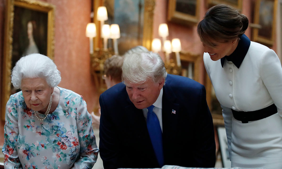 Трампы не могли покинуть Букингемский дворец с пустыми руками. В понедельник днем Королева представила своим гостям президента Трампа и первую леди и преподнесла им очень щедрые подарки во время их официального государственного визита. Мелании подарили специально заказанную серебряную шкатулку с эмалированной крышкой ручной работы. В ее ярко-синем убранстве были розы, чертополох и трилистник, символизирующие потолок музыкальной комнаты Букингемского дворца. Президент Трамп получил первое издание книги о Второй мировой войне от Уинстона Черчилля 1959 года. Малиновая книга украшена золотым тиснением на обложке, корешке и внутренней стороне обложки, золотым шифром EIIR спереди, шелковым переплетом и вручную сшитыми повязками в цветах флага США со всеми страницами, окаймленными позолотой. Президент США, который приземлился в понедельник утром, также получил набор из трех частей —авторучку, ручку роллер и шариковую ручку с шифром EIIR — с использованием обсидиана, исключительно сделанного д
