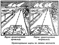 В этом случае необходимо выйти на дорогу, просеку, берег реки или другую линию. Отыскать ее на карте и затем поворачивать карту до тех пор, пока направление дороги (линии) на карте не совпадет с направлением дороги (линии) на местности. Затем проверить, чтобы предметы, расположенные справа и слева от дороги (линии), на местности находились с тех же сторон, что и на карте.