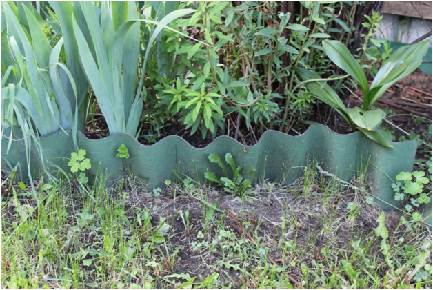 Еще одна короткая летняя статейка от хозяйки загородного дома и множества клумб. Всё время спасаю свои клумбы от сорняков. Мысль соорудить такой бордюр пришла мне, когда я думала, чем оградить цветы от сорняков и триммера одновременно. Если в землю можно вкопать бордюрную ленту и она остановит газонную траву, которая лезет на клумбы с цветами, то вот что соорудить над поверхностью - было задачей. Хотелось, чтобы было красиво, и чтобы удобно монтировалось... Были у меня варианты и из шиферных полосок - не нравится серый цвет и отсутствие гибкости; и заборчики пластиковые ставила - убрала за слишком "пластмассовый" вид. И даже из кирпичей делала бордюр, как в советском прошлом, в виде треугольников. Вот очередная придумка: Это гибкий шифер марки "ондулин". Лист порезан на полоски шириной 25 см - 15 см в земле, 10 - невысокий бордюр. - он отлично гнётся, я легко сделала клумбы полукруглой формы; - он зеленого цвета - когда трава нарастает, его не видно - мне так нравится; - у него кра