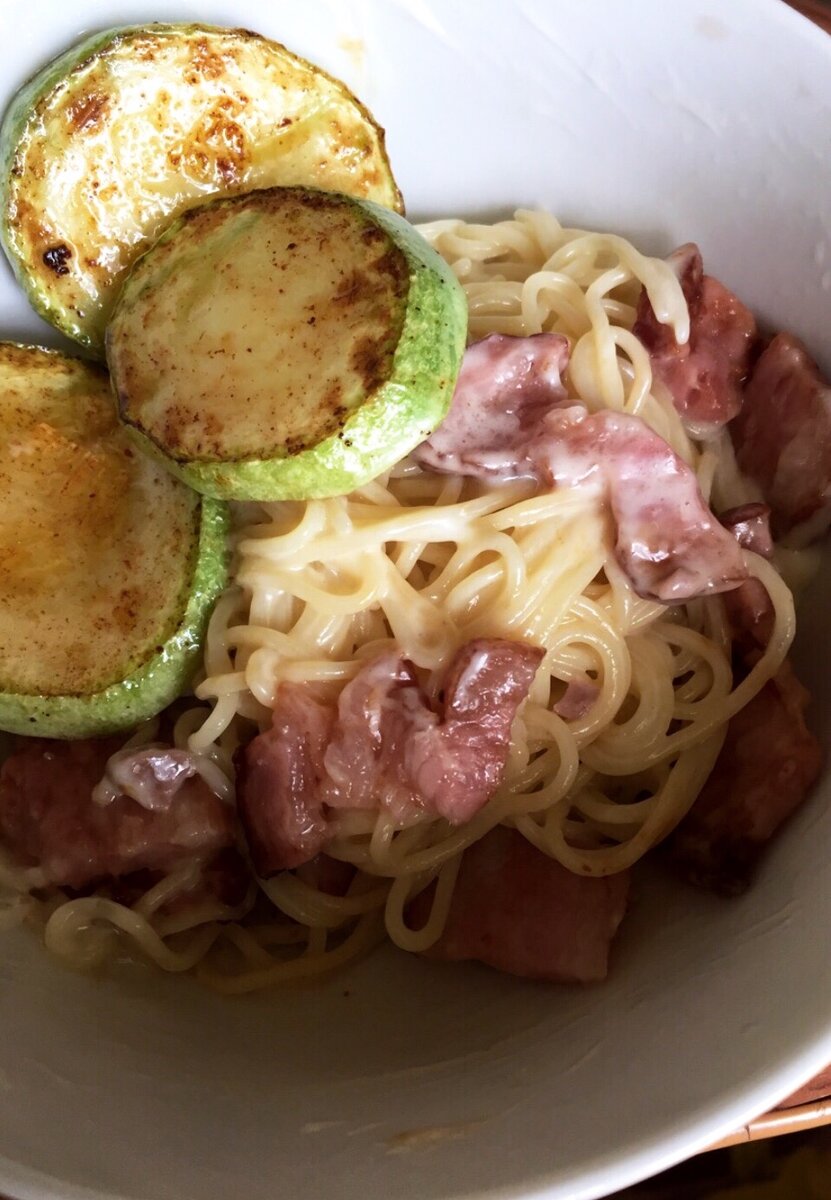 Хочу вам рассказать ещё об одном простом и необычном блюде, которое очень любят в нашей семье. Карбонара по русски. Я совсем недавно открыла для себя этот рецепт, хотя моя мама знала его оооочень давно... подойдут абсолютно любые макароны, я люблю спагетти. Отвариваю спагетти, промываю. В раскаленную сковороду наливаю подсолнечное масло, режу ченок, кидаю его в масло, туда же любую сырокопченую, копченую, вяленую абсолютно любую колбасу, либо бекон, обжариваю все. Почти все готово. Спагетти выкладываю на тарелку, сверху обжаренный бекон и самое главное, это плавленый сыр, любой, приблизительно столовую ложку. В микроволновку буквально на минуту и все готово! Перемешиваем, это очень вкусно. Корбанара на скорую руку.