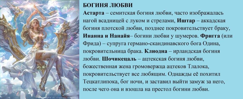 Когда мы размышляем о возвышенном или божественном, мы понимаем, что бог – есть любовь и когда все вокруг в гармонии, мы говорим «божья благодать». Если мы посмотрим на пантеон богов у разных этносов, то невольно удивимся тому, что многие боги и богини олицетворяют принцип: «бог – есть любовь». Например, в древнем Египте, вечно молодая богиня любви Изида, любящая жена Осириса, и чаще всего она изображается с крыльями. Еще есть богиня Хатхор – богиня любви, красоты и плодородия. В древней Греции богиня Афродита когда-то она была богиней гетер, разжигала страсть в людях и богах. У нее были общие дети с Посейдоном, а также богом огня Аресом, но законным мужем стал Гермес, и после замужества она завязывает с разгульной жизнью и становится богиней семейного благополучия. Сын Афродиты и Ареса – бог любви Эрот (Эрос), изображался в основном в виде ангелочка. Именно он, пуская стрелы любви, обеспечивает продолжение жизни. У римлян известная всем богиня любви Венера, Амур символизирует приро
