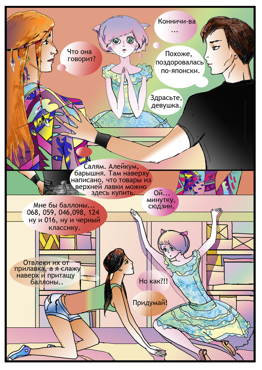 - Секундочку, сюдзин! - Нека вымучила улыбочку и нырнула в залежи коробок, где, как в домике сидела с такими же огромными напуганными глазами Леля. - Отвлеки их от прилавка, а я слажу наверх и принесу баллоны. - Но как?!!! - Придумай!!! Чаем их напои! - Ага… Чудная котодевочка вынырнула из-под прилавка, и тут же столкнулась взглядом с вольготно облокотившимся на стол Перри. Перри готов был поклясться, что волосики у этого котенка даже на ушках встали дыбом. Остатками воспитания Перри удержал дернувшуюся погладить эту светящуюся в золотистом свете шерстку руку. Но широкую улыбку удержать не мог. Огромные бирюзовые глаза котенка метали молнии, но тем не менее посетителям была подарена приветливая улыбка: - Не хотите ли чаю? - Хотим! - Да мы спешим, вообще-то. - Родионов! Ты че, жрать не хочешь? На тебя не похоже! И пить? Мое горлышко вот совсем пересохло. Оригато! Милая девушка! Оригато! Мы с огромным, просто огромным удовольствием изопьем любого чая из Ваших милых рук! Парень в черно