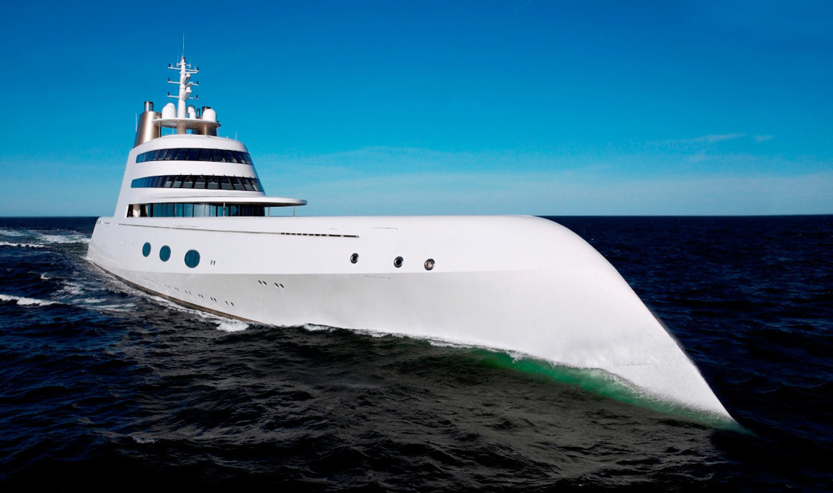 Особенности: Автор концепции и дизайнер Филипп Старк с техническим дизайнером Мартином Фрэнсисом создали абсолютно нестандартную яхту, внешне больше похожую на подводную лодку. Тем не менее, этот экстравагантный вроде бы облик вполне оправдан задачей: яхта «А» способна плавать во льдах. Скорость вроде бы скромная – 23 узла, зато способна пройти многие тысячи миль. А если захочется скорости, то можно пересесть на тендер, один из которых, 10-метровый, развивает 45 узлов, два других, 11-метровых – по 35. А кроме этих трёх есть ещё десятка полтора, да и вертолёт не забыт. На яхте есть три бассейна, один из которых, на верхней палубе, – с прозрачной крышей, а другой, на корме, оснащен системой подачи воды, имитирующей течение.