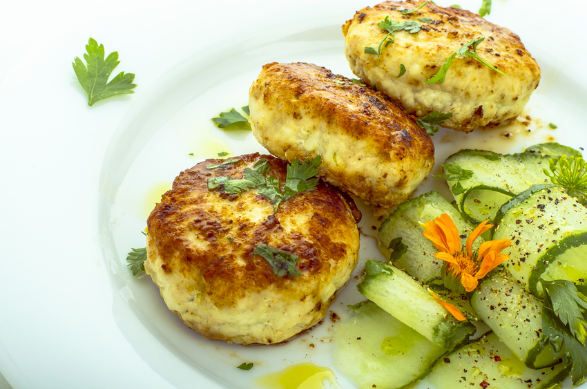 Котлеты из курицы и кабачков - это прекрасные котлетки с сочным кабачком и нежной курочкой, а если их хорошенько поджарить, то еще и с хрустящей корочкой Количество - 6 - 8 шт., Время приготовления - 20 минут (+ 30 минут, чтобы фарш настоялся) Ингредиенты: • куриное филе - 300 гр., • луковица - 1 шт., • кабачок или цуккини - 1шт., • овсяные хлопья "Геркулес" или отруби - 2/3 стакана, • панировочные сухари или мука, • соль. Способ приготовления: 1. Лук, кабачок очистить и вместе с куриным филе пропустить через мясорубку или мясо и лук очень мелко нарезать, а кабачок потереть на крупной терке. 2. В результате получится жидкое пюре, в которое необходимо добавить "Геркулеса" или рассыпчатых отрубей столько, чтобы масса загустилась до состояния сметаны. 3. Перемешать и поставить на 30 мин, чтобы овсяные хлопья или отруби набухли и впитали лишнюю влагу. 4. Когда сок впитается, руками сформировать котлеты и обвалять в муке или панировочных сухарях. 5. Жарить лучше на сливочном масле, но мож