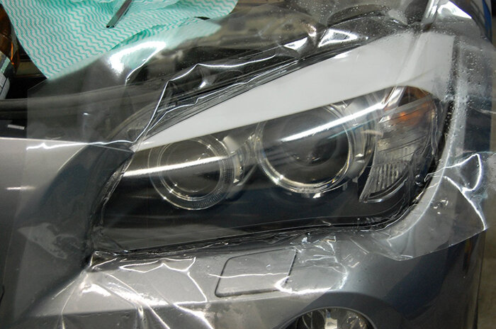 - Покройте фары пленкой, выгните из-под ее поверхности воду и пузыри воздуха.