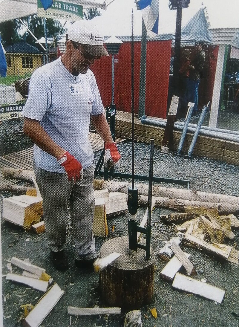 Колка дров вручную — занятие утомительное и малопроизводительное. Между тем, традиционно камин или садовая печь топятся именно дровами, создающими очаровывающую уютную атмосферу в доме, насыщая неповторимым ароматом приготовленные на огне блюда. В Финляндии, стране, где и сегодня остается актуальным печное отопление, на ежегодной строительной ярмарке в местечке Лаукаа вблизи города Ювяскюля была представлена ручная машина для колки дров. Агрегат повышает производительность работы и вместе с тем не требует от человека больших усилий. В основу устройства, как несложно догадаться, положен принцип гильотины. А сам механизм работы следующий. Обыкновенное полено, чурбак, устанавливается на «плахе», в край которой воткнут прочный металлический стержень. Сверху на полено опускается специальный нож, скользящий по этому стержню. Таким образом полено остается закрепленным между «плахой» и ножом. Далее, под действием тяжести опускаемого груза, находящегося на другом металлическом стержне, нож прив