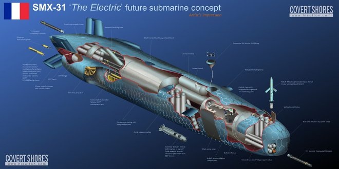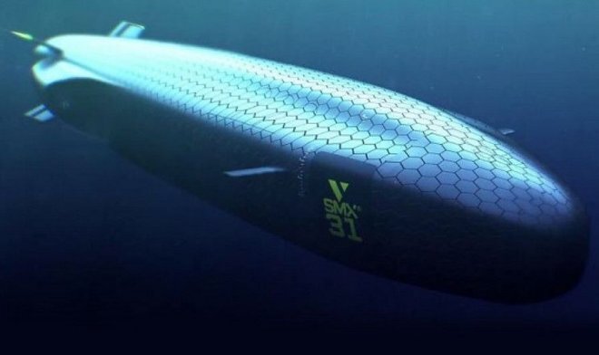 Одна из французских оборонных компаний представила концепт полностью электрической подводной лодки SMX-31, которая отличается от всех ныне существующих. Дело в том, что создание многих ее элементов «подсказали» кашалоты. Концепт был представлен на парижской выставке Euronaval 2018. Самая заметная особенность, делающая SMX-31 похожей на кита – отсутствие рубки. Лодка оснащена выдвигающимися подводными крыльями, а ее корпус имеет необычное покрытие в виде шестиугольников с интегрированными сенсорами. Ее движение обеспечат два водометных движителя. Лодка состоит из двух корпусов – наружного легкого и прочного внутреннего. Длина субмарины – 70 метров, высота и ширина – по 13,8 метра, водоизмещение – 3400 тонн, максимальная скорость – 20 узлов, предельная глубина погружения – более 250 метров. SMX-31 будет вооружена торпедами и ракетами (всего 46 единиц). Экипаж – 15 человек, запас хода 30-45 дней в зависимости от емкости аккумулятора. На ее борту могут также размещаться подводные беспил