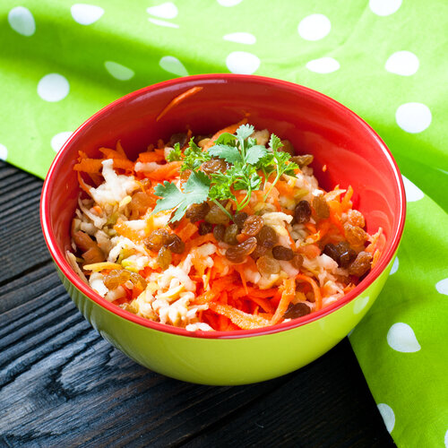 5. Смешать морковь, яблоко и изюм, сбрызнуть лимонным соком и добавить мёд. Больше рецептов на Racionika.ru!