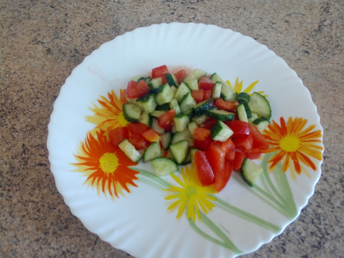 1) Чашка зелёного чая без сахар 2) 150 грамм салата (состав - огруцы , помидоры , растительное масло (половина столовой ложки) и щепотка соли. Скажу сразу - так как сейчас сезон фруктов и овощей , мы создали своё меню практически только из овощей и фруктов. Меню это рассчитано на неделю. Расскажу наш запланированный суточный рацион питания , и продукты , которые мы планируем употреблять в течении этой недели. После такого завтрака ещё чувствовался лёгкий голод , но спустя буквально 20-25 минут он прошёл и мы стали чувствовать себя сытыми.