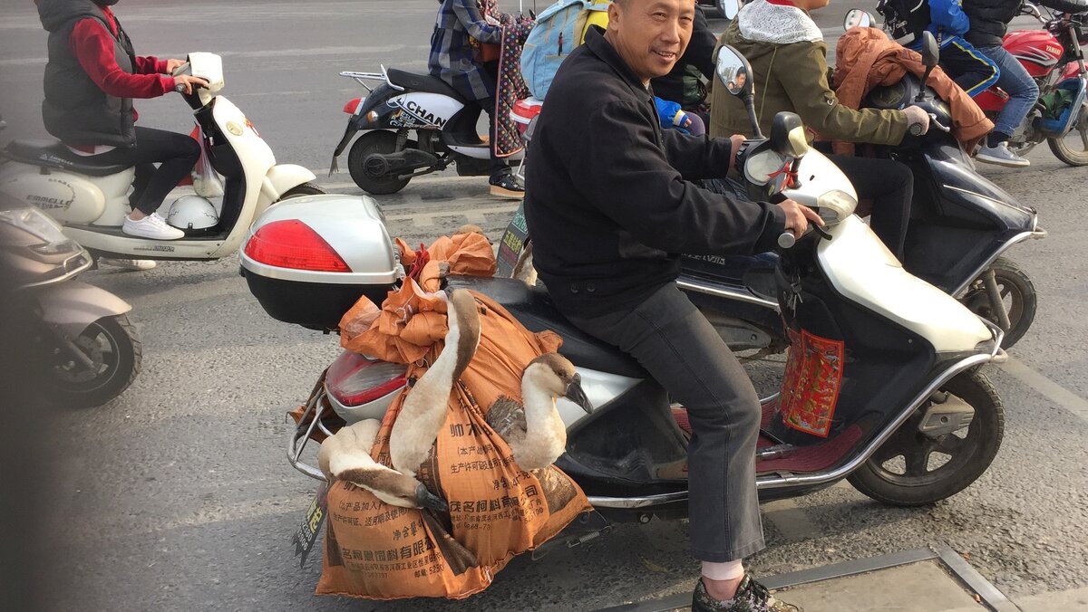 Любим мы Китай, за то что он такой простой и непринужденный. Столько всего необычного происходит в обычной жизни Поднебесной. Хоть фильм снимай, чем мы, собственно, порой и занимаемся. По пути на работу, на светофорах часто можно запечатлеть забавные жизненные "картины" простолюдин. Вот милый на лицо местный китаец едет со своим "зверинцем" гусей. Он привязал их прямо у заднего колеса. Те, как ужи, только извивали свои длинные шеи. Наверняка добрый хозяин перевязал их покрепче, может даже уже передавил им крылья. Всё равно они пойдут в суп какого-нибудь ресторана. По пути в центр, просто прогуливаясь одним прекрасным вечером, мы заметили как китаянка сжигает обрядные деньги. Эта тётенька сильно хочет помочь своим умершим предкам. Прямо на тротуаре она решила помолиться им, и "послать" подношения.