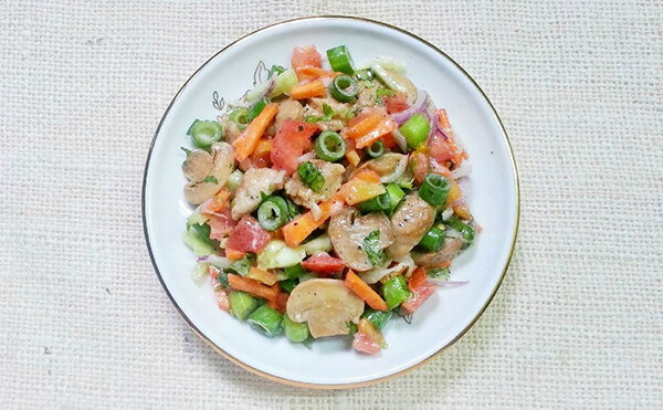 У всех нас есть 1 или 2 самых любимых блюда. Сегодня я хочу поделиться с вами рецептом своего любимого летнего, и в то же время сытного салата из курицы, грибов и овощей. Надеюсь, вам тоже понравится! Шаг 1: Ингредиенты Для приготовления этого салата вам понадобятся: Шаг 2: Подготовка ингредиентов Нарежьте курицу на мелкие кусочки. Также нарежьте грибы тонкими дольками. Мелко нарежьте овощи. Чем больше овощей, тем лучше! Шаг 3: Смешивание и маринование К нарезанным кусочкам курицы добавьте порошок тмина, белый перец и соль. Хорошо смешайте и оставьте в сухом и прохладном месте, пока будете нарезать овощи. Положите нарезанные овощи в миску. Добавьте к ним четверть чайной ложки черного перца и щепотку соли, очень хорошо перемешайте. Шаг 4: Жарим курицу и грибы В сковороду добавьте 2 столовые ложки сливочного масла и поставьте на средний огонь. Как только масло полностью растает, уменьшите огонь до среднего и добавьте кусочки ку