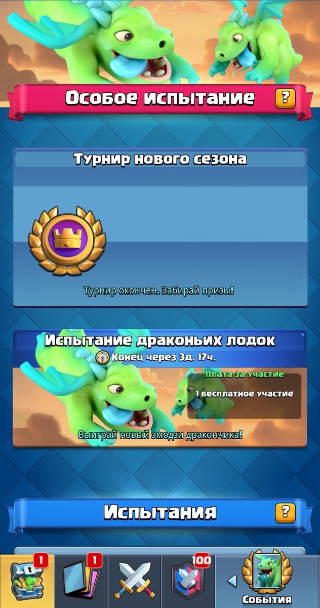 Сегодня началось очень интересное событие в Clash Royale - "Испытание драконьих лодок" Главный приз испытания- эмодзи В честь этого события разработчики добавили специальные наборы в игровой магазин. Появились сундуки и одна новая эмодзи,которой не будет в продаже 3 месяца. В магазине появилось и одно бесплатно предложение- магический сундук Чтобы получить новую эмодзи ,нужно сделать 10 побед, проиграть можно всего 2 раза. Данное испытание я прошел вот этой колодой. Вместо огненного шара (Fireball) можно взять снежок (Snowball). Этой колодой было пройдено данное испытание уже на двух аккаунтах. А вы прошли это испытание ? Лёгким или сложным она для вас было? Какой колодой играли? Пишите свои ответы в комментариях)
