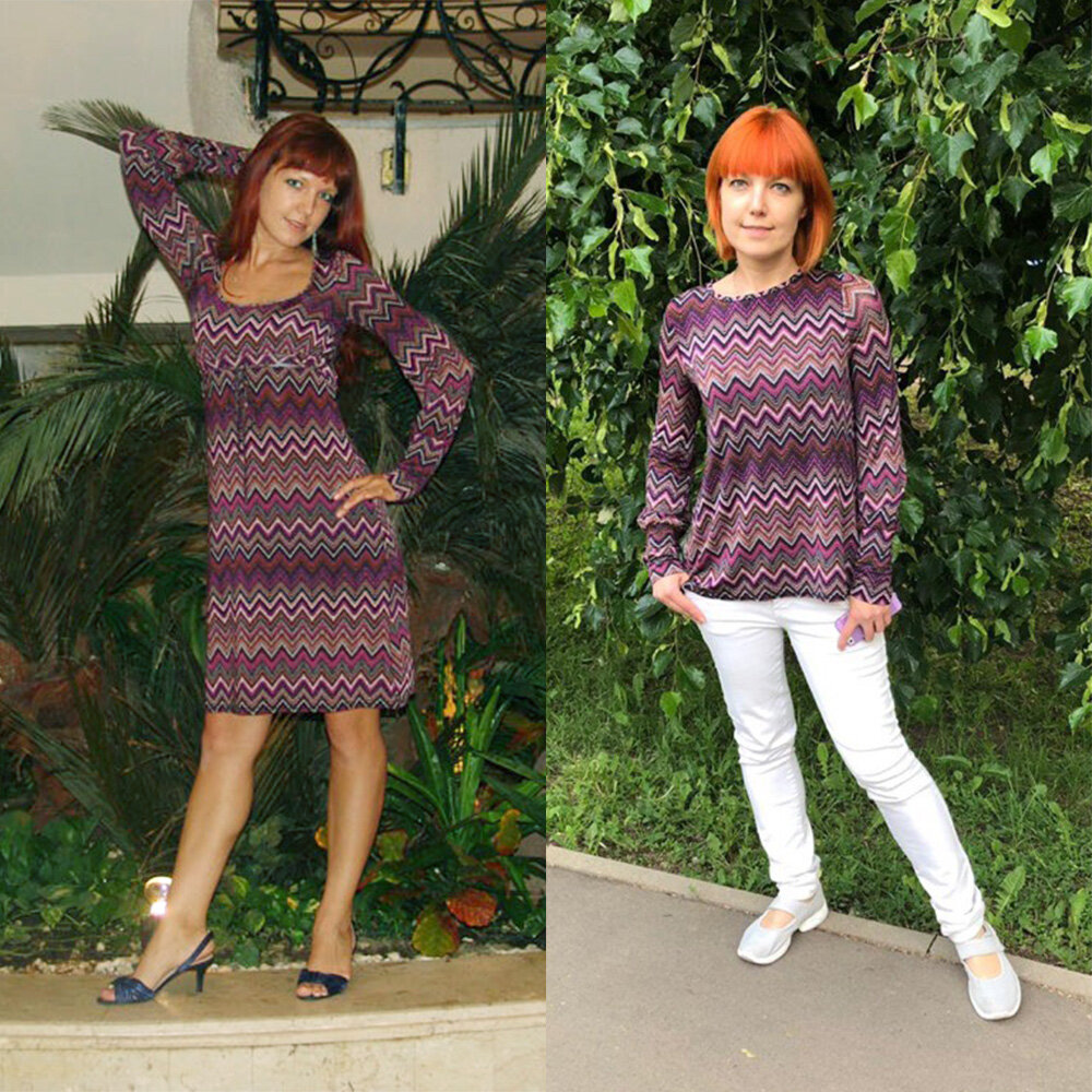Всем добрый день. Сегодня речь пойдет о переделке одежды или иными словами о "новой жизни вещей". Поносила вещь, надоела - переделываю. А иногда просто разонравилась или оказалась не очень удобной, или по другой причине. Например, "случилась" зацепка на ткани на самом видном месте или прислонилась к качелям со свежей краской)))). Да на самом деле причин для переделки своих вещей полно. Но конечно, я не все вещи переделываю, лишь малую часть.... Ту часть, которую выбрасывать жалко. Бывает так, что очень нравится ткань, из которой сшита вещь. В таком случае я перешиваю вещи, причем иногда кардинально. Речь не идет о том, что вещь велика и ее нужно просто уменьшить. А именно делаю другой фасон или вообще, как в этом примере из платья сделала кофту. Платье мне тоже нравилось - но в какой то момент декольте стало слишком открытым... Что сделала? Отпорола рукава, убрала отрезной лиф вообще и из нижней части платья выкроила перед и спинку. Получилась классная расклешенная к низу кофто