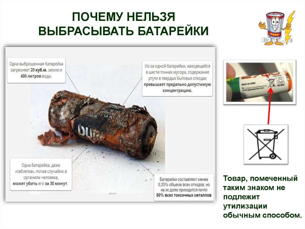 - щелочи — прожигают слизистые оболочки и кожу Выброшенная в мусорное ведро батарейка попадает на свалку, где в процессе коррозии либо в результате горения выделяет вредные вещества. Далее токсины вместе с водой и едой попадают нам на стол. Ядовитые элементы имеют свойство накапливаться в организме, поэтому даже в небольших количествах могут вызвать онкологические, репродуктивные и другие серьезные заболевания. Теперь вы понимаете, что батарейки ни в коем случае нельзя выбрасывать в мусорно