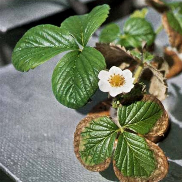 Симптомы недостатка бора можно наблюдать как на листьях, корнях, так и на плодах земляники. Определить дефицит бора можно по листьям: сильное искривление молодых листочков, листочки начинают заворачиваться вверх, у старых листьев по краю появляется желтая кайма, а корни становятся кряжистыми.