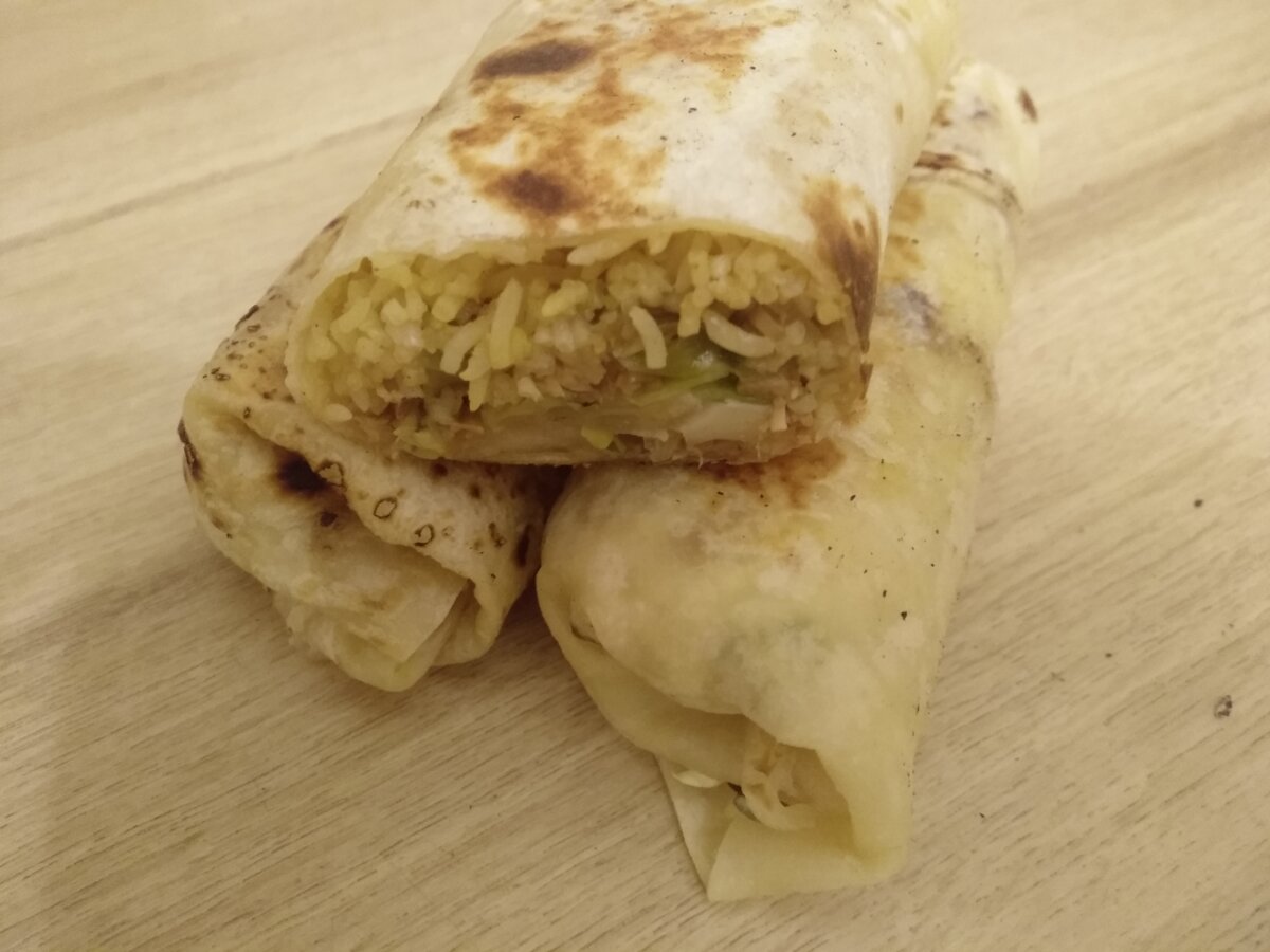 Очень вкусный буррито с курицей " Терияки", салатом из капусты и рисом. На 3 буррито 3 лепешки тортилья Курица терияки: 150 гр. филе куриного бедра 50 мл. рисового вина 25 мл. сладкого соевого соуса 1/3 ч.л. кунжутного масла 0,5 ст.л. острого соуса чили 2 зубчика чеснока 2 ст.л консервированного ананаса 1 ч.л. апельсиновой цедры 1/3 шт. белого лука 1/3 шт. большого сладкого зеленого перца 1/3 ч.л. кукурузного крахмала 0,6 ст.л. воды цедра 1/3 лайма 0,5 ч.л. свежего имбиря Салат из капусты: 100 гр. красной или белокачанной капусты 2 пера зеленого лука 1 ст.л. рисового уксуса 1 ст.л. майонеза 1/3 шт. перца чили Рис: 0,5 чашки сырого риса Начнем готовить. Начинаем с курицы. Курицу обжариваем на оливковом масле, откладываем. В то же сковороде разогреваем рисовое вино и тушим 1-2 минуты. Уменьшаем огонь, добавляем сладкий соевый соус, кунжутное масло, острый соус чили, мелко нарезанный чеснок, мелко нарезанный ананас, апельсиновую цедру. Доводим до кипения. Заливаем соусом курицу и накрыва