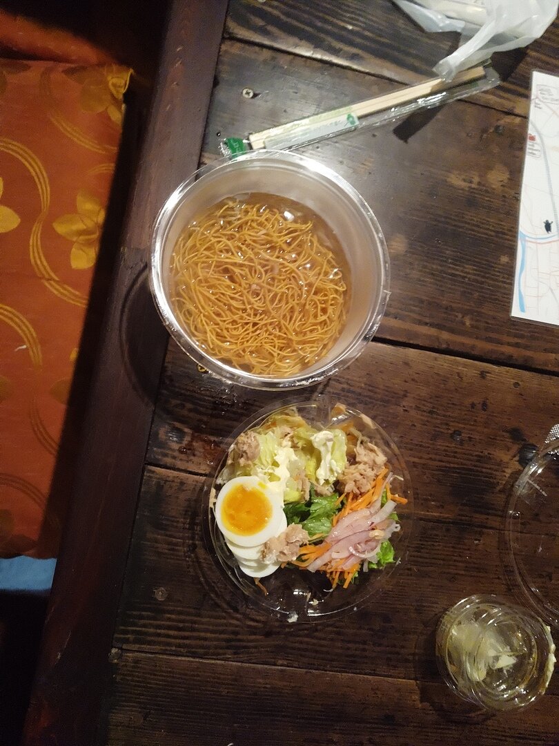 За 368 иен (курс вроде 0,6 иены к рублю) можно получить прозрачное корытце с макаронными изделиями на дне. Отдельная подложка - с яйцом, каким-то мясом с майонезом, густой приправой и свежей капустою.