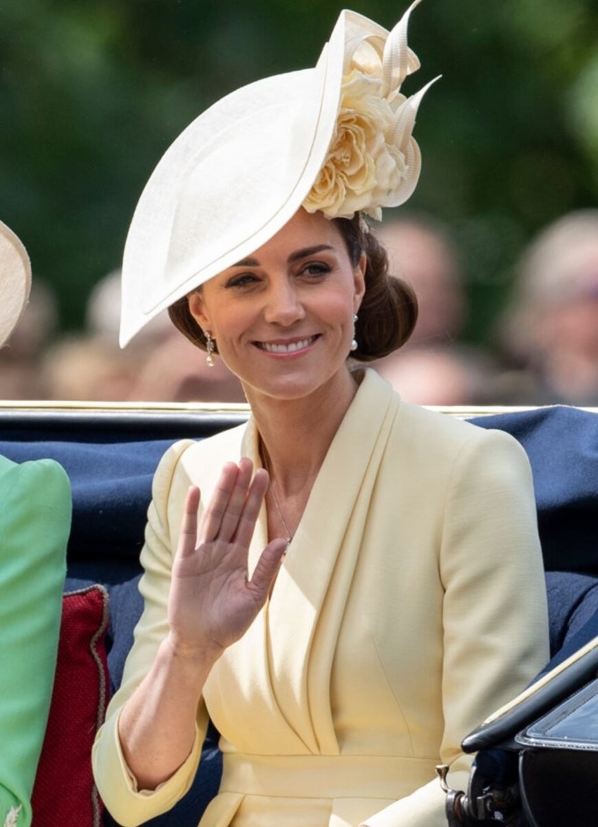 Сегодня в Великобритании отмечается церемония выноса знамени, которая называется "Trooping the Colour". Этот день является официальным днем празднования появления на свет королевы Елизаветы II. Хотя на самом деле день рождения монарха 21 апреля. Почему Королева Елизавета отмечает День рождения в июне, когда он у нее в апреле? В этот день около Букингемского дворца собираются толпы поклонников королевской семьи, а в самом параде принимает более полторы тысячи гвардейцев. Также "Trooping the Colour" сопровождается маршем под музыку, выносом знамени, парадом конной гвардии, салютом. Кейт Миддлтон прибыла на парад в платье-пальто кремового цвета. Ее образ дополнила шляпка в цвет с огромными цветами. Это платье нежного цвета Кейт надела впервые, как вы уже догадались, это излюбленный бренд герцогини Кембриджской "Alexander McQueen". Шляпка Кейт от "Philip Treacy". С ней в карете мы видим принца Гарри и Меган Маркл, которая удивила своих поклонников сегодняшним выходом, ведь она находи