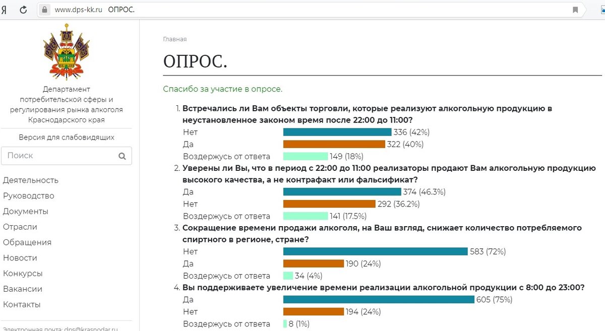Уважаемые жители Крымского района! Департамент потребительской сферы и регулирования рынка алкоголя Краснодарского края в связи с обращениями ритейлеров, осуществляющих реализацию алкогольной продукции, запустил опрос об отношении населения региона к увеличению времени реализации алкогольной продукции с 8.00 до 23.00 часов. Мониторинг проходит на официальном сайте ведомства www.dps-kk.ru, окошко с голосованием появляется автоматически, как только посетитель заходит на портал. Просим вас принять участие в опросе.