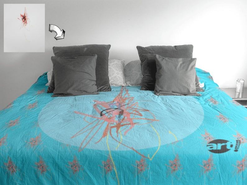 ArtCadabra интересный проект, созданный американкой по имени Тиш из города Нью-Йорка. Будучи молодой мамой, она нашла свое вдохновение в рисунках собственного сына. Малыши всегда дарят на праздники нарисованные открытки. Тиш не исключение! Её маленьких сын, преподнёс в качестве сувенира рисунок, созданный пальчиковыми красками. И переполняемая любовью и нежностью к отпрыску, ей захотелось сохранить творение на более прочном носителе, нежели бумага. Её идею одобрили и подхватили друзья, знакомые и коллеги. Которые, также решили поступить с рисунками своих деток. Вариантов перенесения рисунков, предложенных Тиш очень много. Но особой популярностью пользуется постельное белье с таким оригинальным принтом. Все работы ведутся под заказ, чтобы заказать такое творение, нужно прислать рисунок и указать размер белья. Также Тиш занимается ретушированием и доработкой рисунков. И при Вашем желании она может изменить цвета, экспозицию или внести дополнительные элементы. Кто-то в восторге от