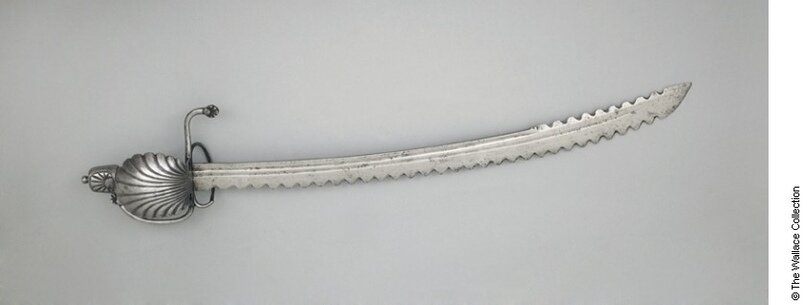 Хранится данный предмет клинкового оружия в собрании музей Уоллеса, Лондон. Относится к категории «ланг мессеров» или «гросс мессеров» в германской терминологии Позднего Средневековья и Раннего Нового Времени. Так же к подобным артефактам мог применяться термин «дюссак». По сути — это крайне редкий образец сабли с пламенеющим клинком «фламберг». Характер конструкции эфеса позволяет с высокой вероятностью датировать саблю 1590-1610 гг., хотя, возможно, она имела хождение и позже. Обычно считается, что клинок имеет итальянское происхождение, чему, правда, достоверных подтверждений найти не удалось. Типические черты клейма, напротив, находят аналогии среди памятников круга мастерских Пассау или Мюнхена. В любом случае, монтировка однозначно указывает на то, что клинок в конечном итоге приготовлялся для использования в Германии и, скорее всего, там же и изготовлен. Длина общая 939 мм, ширина 37 мм, вес 1,065 кг.