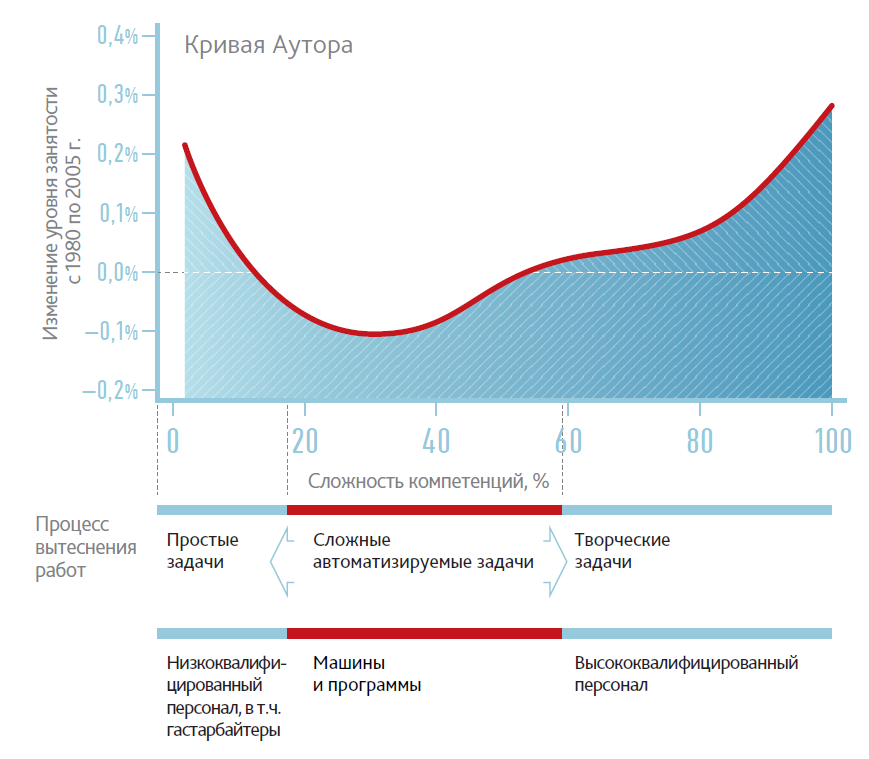 При этом наибольшее сокращение приходится на рабочие места средней квалификации. Эту тенденцию обнаружил в начале двухтысячных американский экономист Дэвид Аутор, который и нарисовал кривую, получившую его имя: