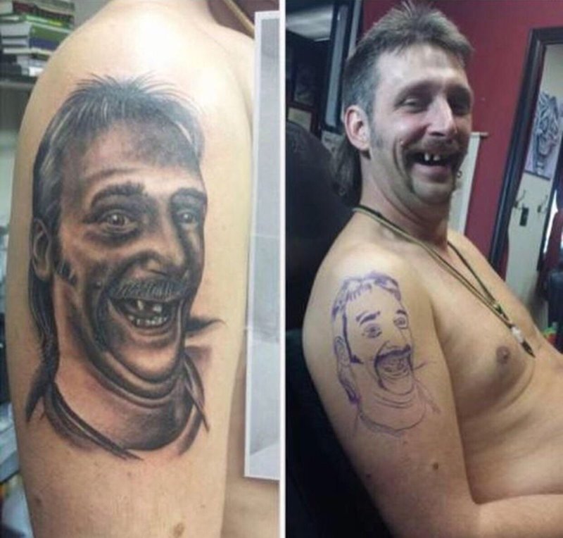 Сегодня татуировки популярны как никогда ранее, что уж говорить, даже людей что их наносят, только в моём дворе минимум четыре человека. Оттого каждый человек решает сам, какой рисунок себе нанести, в меру всей своей иногда обезображенной фантазии! Ниже приведены татуировки очень даже приличного качества, но мучает один вопрос! Зачем они нужны его носителю?! Идеальный портрет! Его лицо похоже на очередной мем! Зачем ему эта татуировка? Показать внукам какой он был в молодости красавчик? Ему бы в комедиях играть, с таким лицом он бы удачно вписался на роль — деревенщины дурачка. Татуировка лысой Бритни Спирс Как только не обыгрывалась шутка с лысой Бритни! Этот человек зашел дальше остальных... Кто может сказать, что хотел сказать человек этой татуировкой? Сомневаюсь что он фанат Бритни. Лакоста-бой? Татуировка известного бренда, надеюсь ему заплатили, иначе он просто идиот! Я бы ещё понял, если бы парень был фанат тату и для кучности нанёс бренд "Лакост", но парень вроде чист, что ната