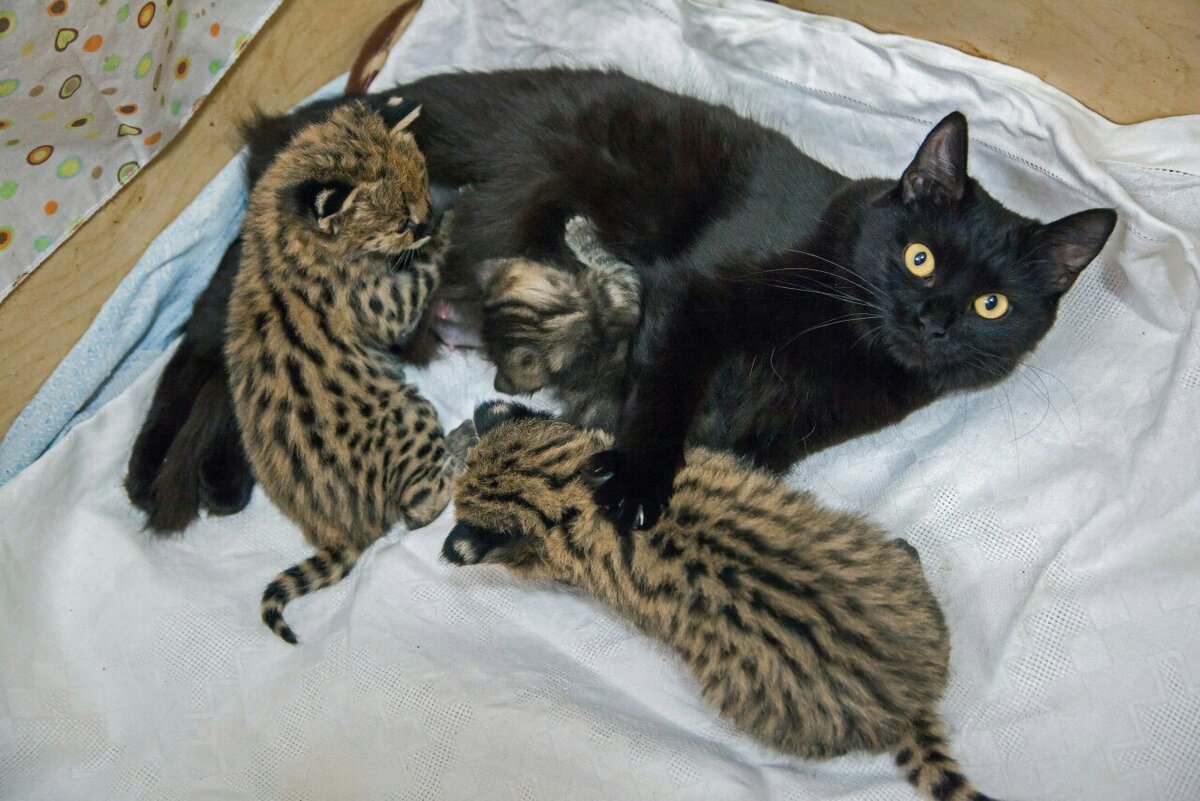 Домашние кошки — отличные мамы (и не только для своих котят). Они часто выручают зоопарки, в том числе и Новосибирский, где летом 2017 года почетный статус "приемная мама" получили сразу 2 кошки. Дикие кошки могут отказаться кормить своих отпрысков по многим причинам: начиная от стресса, заканчивая состоянием здоровья. И тогда на помощь приходят их домашние сородичи. Черная кошка, жившая в зоопарке, приняла в свою семью одного дальневосточного котенка и двух детенышей сервала. Белой же досталась пара малышей каракала. Обе кошки сразу взяли малышей себе на попечение. Все сложилось очень удачно. Приемные мамы стали ответственными родительницами — они с радостью их грели, играли с ними и оберегали от всех опасностей.