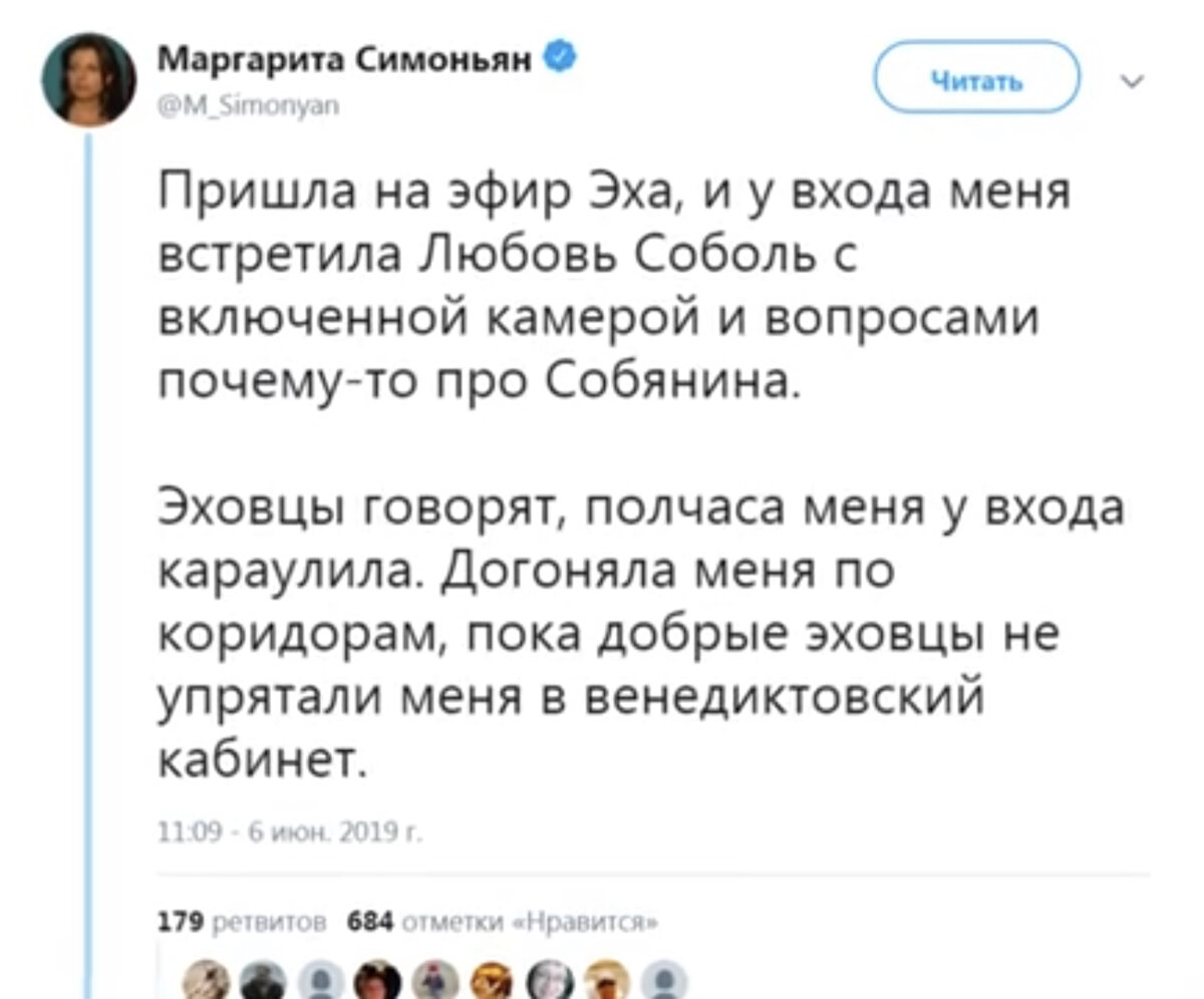 В оппозиционном лагере появился новый повод для радости - «любимая жена» Навального, «юрист» Любовь Соболь, одна из немногих женщин на сосисочной вечеринке Фонда борьбы с коррупцией главного клоуна российской оппозиции, смогла-таки заткнуть за пояс главную «кремлёвскую пропагандистку» Маргариту Симоньян. Для тех, кто в танке: 31-летняя жительница Москвы, экс-помощник судьи в Пресненском суде Москвы, а ныне - юрист и оппозиционный блогер, Любовь Соболь намерена осенью этого года проползти без вазелина в главный законодательный орган столицы белокаменного Мордора - в Московскую Городскую Думу, в которой намерена представлять интересы одного из районов Центрального Административного Округа. Намедни на волнах неполживой радиостанции «Эхо Москвы» должна была выйти программа, в которой сошлись бы «говорящая голова» Навального Любовь Соболь и главный редактор RT и Sputnik Маргарита Симоньян. На подходе к студии главред АрТи была натурально атакована вопросами по поводу очередного «расследо