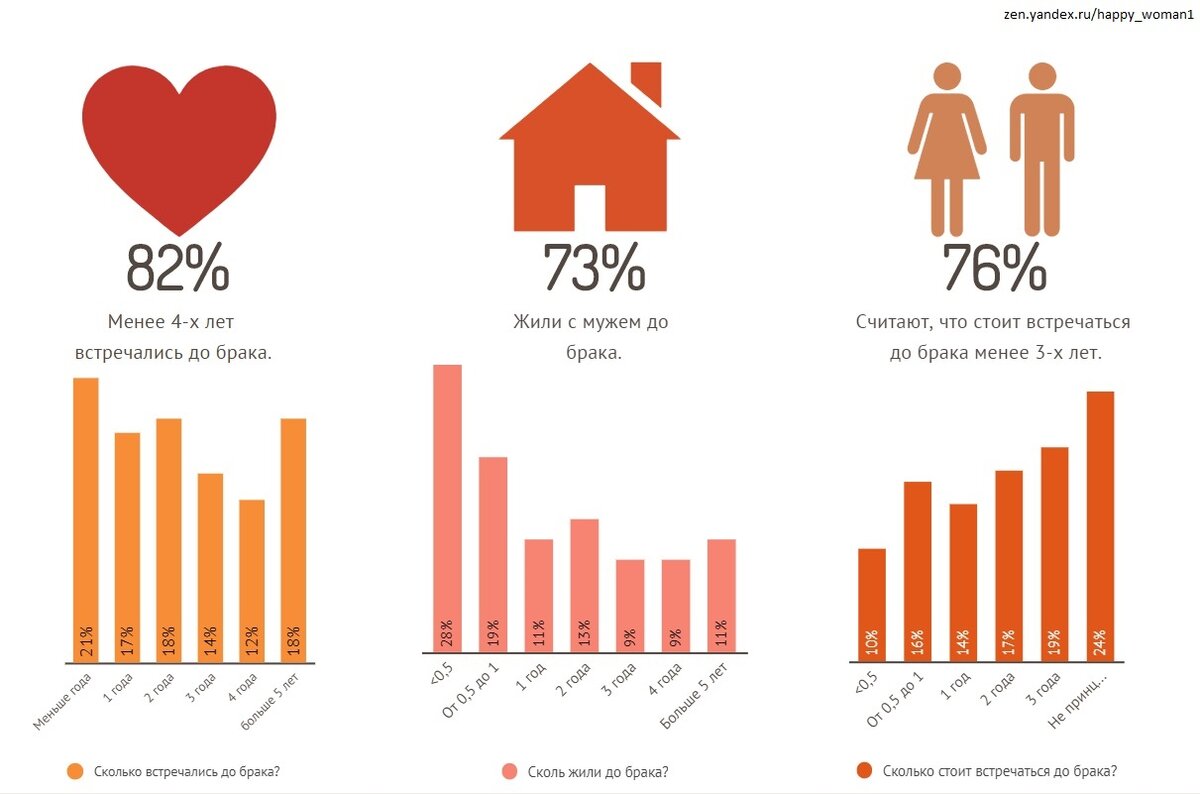 В среднем девушки встречались и жили со своими мужьями до брака 3,5 года. Хотя интересно, что по этому показателю был сильный разброс, 18% были в отношениях до штампа больше 5 лет, 21 % меньше полугода. Более детальные результаты вы можете увидеть на инфографике.