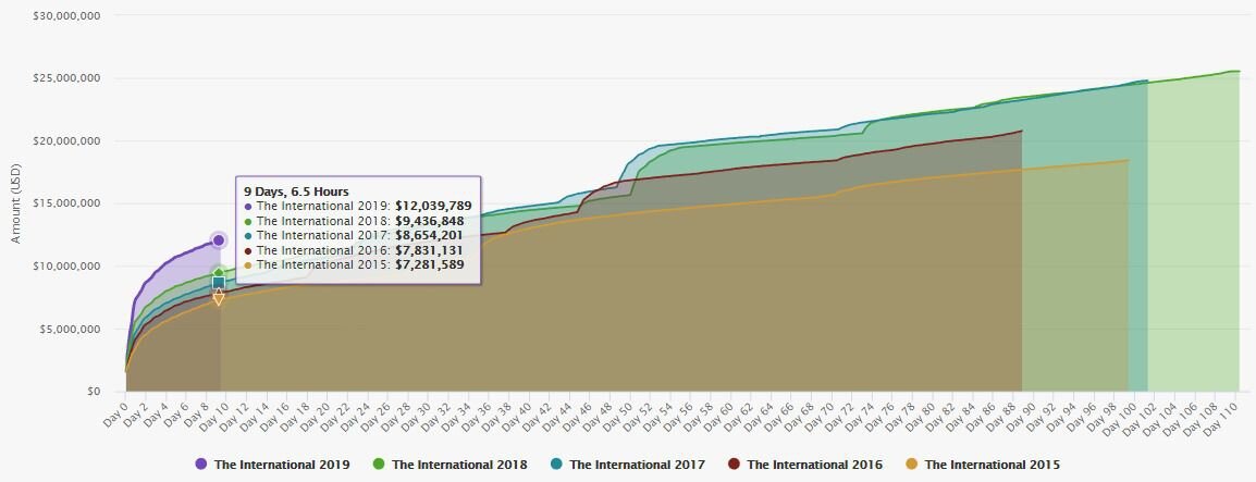 Призовой фонд The International 2019 достиг отметки в $12 млн через 9 дней после выхода Battle Pass для Dota 2. Это на $2,5 млн превышает сборы The International 2018 за аналогичный период. Начиная с 2012 года стартовый призовой фонд турниров серии The International составляет $1,6 млн. Каждый год он увеличивается за счет отчислений с продажи Боевых пропусков. The International 2019 пройдет с 15 по 25 августа в Шанхае на площадке Mercedes-Benz Arena. Бороться за него будут 18 команд из шести регионов. Инвайты на турнир уже заработали Virtus.pro, Team Secret, Team Liquid, PSG.LGD, Vici Gaming, Evil Geniuses, Fnatic и Ninjas in Pyjamas.