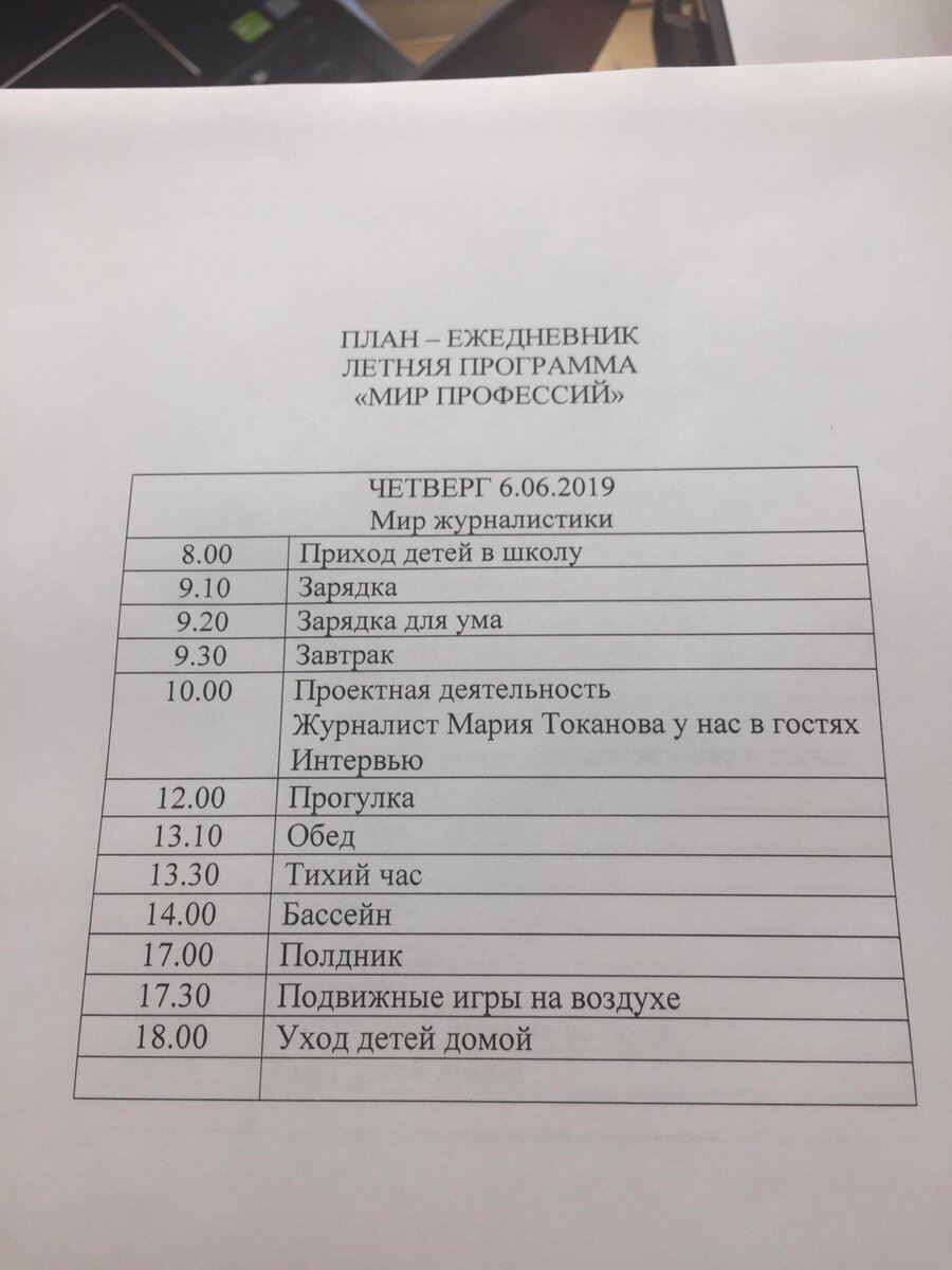 На лето наша школа организует бесплатный лагерь для учеников школы. Вот примерный распорядок дня: Каждый день что-то новое в проектной деятельности. Вот например была встреча с журналистом. Успели мы на этой неделе посетить фабрику мороженого. Поработали над созданием собственной телестудии. И над созданием собственных проектов передач. Ну и самое увлекательное посещение бассейна. Надеюсь следующая неделя будет не менее увлекательной. 👍