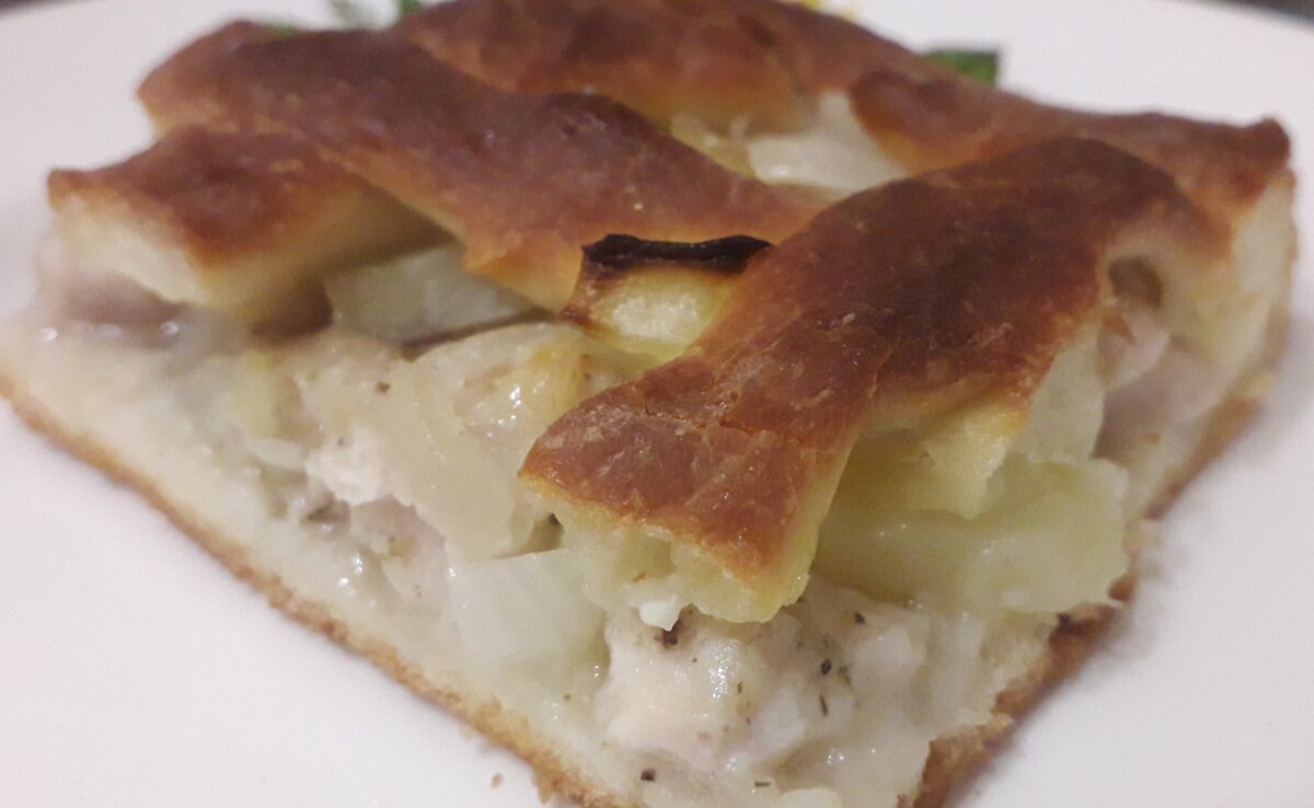 Предлагаю вам способ украшения пирога переплетение лент или плетенкой. Таким способом можно украсить пирог круглой формы, прямоугольной или пирог любой другой формы. Начинку можно делать как сладкую так и соленую. И тесто для пирога можно выбрать на свой вкус дрожжевое, бездрожжевое, слоеное и тд. Ингредиенты: Готовое дрожжевое тесто 1 кг Куриное филе 300 гр Картофель средний 2 шт Луковица 1 шт Соль, черный молотый перец по вкусу Приготовление: Для пирога я использовала универсальное дрожжевое тесто, рецепт можно посмотреть здесь. Готовое тесто делим на две неравные части. Ту часть что больше раскатываем в пласт толщиной 0,5-0,7 см и выкладываем в форму предварительно смазанную растительным маслом. Форму можно взять абсолютно любую, у меня обычный прямоугольный противень. На тесто выкладываем любую начинку по вашему вкусу. У меня начинка для курника. Куриное филе, картофель и лук режим кубиками или брусочками, солим, перчим по вкусу и перемешиваем. Второй кусочек теста раскатываем в п