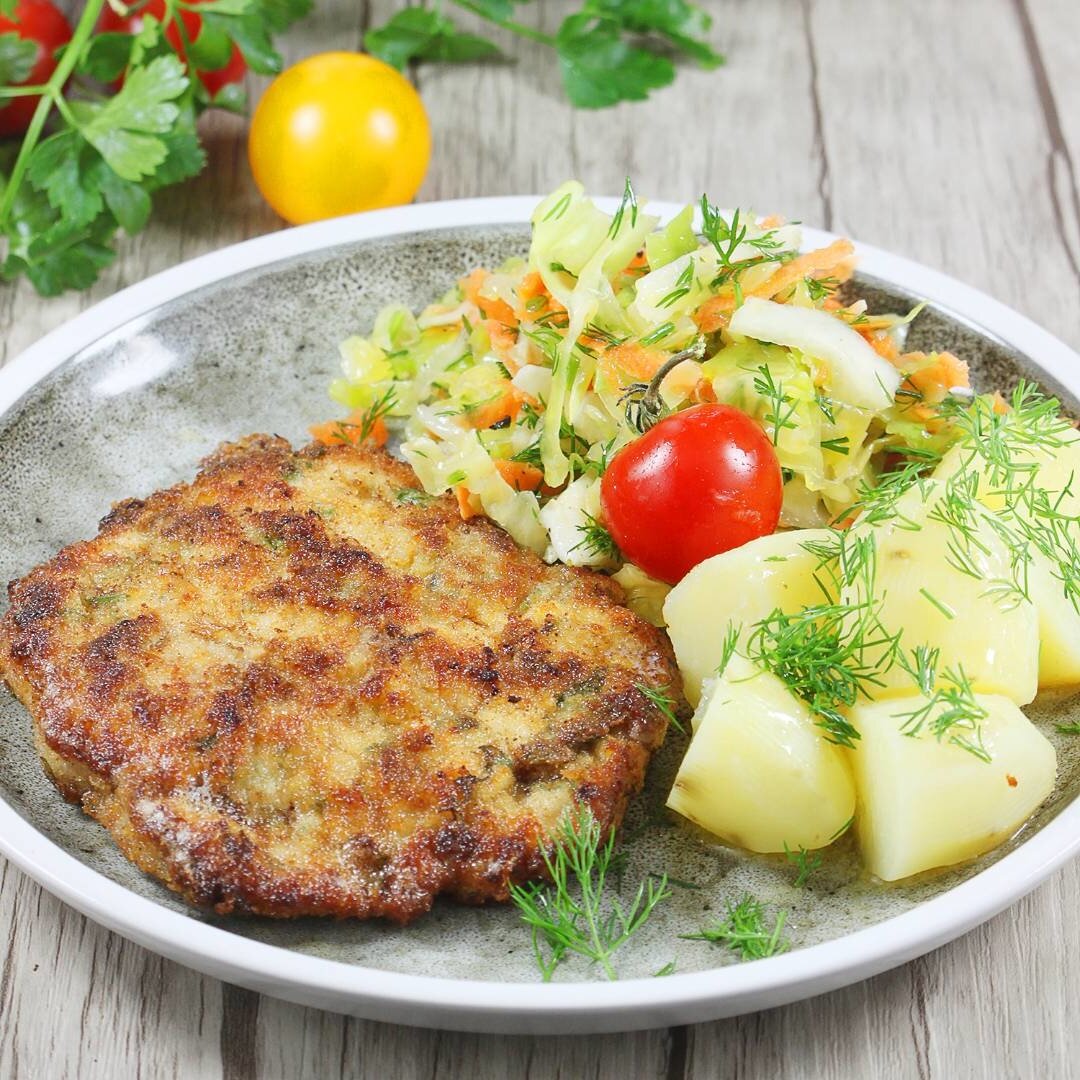 Калории были посчитаны на основе ингредиентов, используемых мной. Так что это приблизительное количество калорий, потому что даже ваше масло или мясо могут иметь другое количество калорий, чем ингредиенты, которые я использовал. Из заданного количества ингредиентов вы получите четыре очень больших молозива. При подсчете калорий я учел долю панировочных сухарей и масла. Я не считал добавок в виде картофеля и салатов, представленных на картинках.