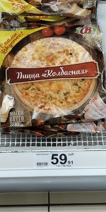 Пицца "Колбасная" продается в магазине "Ашан" за 59 рублей. Пицца полностью готовая, охоложденная (не замороженная) остается только разогреть. Масса нетто: 300 грамм. Взял эту пиццу для пробы, и потому что в холодильнике было совсем пусто, а готовить было лень. Пицца большая, видно нормальное количество мелко нарезанной колбасы и расплавленного сыра. И все! Больше никаких ингредиентов на ней нет! Даже тесто не смазано каким-нибудь соусом, типа кетчупа. Пицца вкусная и очень сытная. Тесто мягкое, колбаска и сыр тоже неплохие. Этой пиццей можно неплохо перекусить, например на завтрак. Но, к сожалению, кроме сыра и вареной колбаски не ней ничего нет(((( Если бы на нее добавить немного грибочков, маринованных огурчиков, или хотя бы тесто помазать томатной пастой - пицца была бы исключительной за свои деньги).