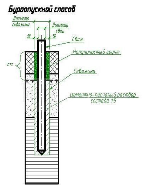 На многолетнемёрзлых грунтах в большинстве случаев применяются буроопускные сваи с гладкой боковой поверхностью. В предварительно пробуренную на определённую глубину скважину опускают сваю, а пространство между сваей и стенками скважины заполняют грунтовым раствором и выдерживают до смерзания с окружающими грунтами. Нагрузка от сооружения передается на грунты основания через нижний конец сваи и боковую ее поверхность.