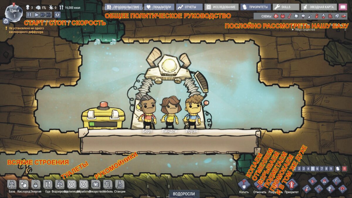 Первые игровые сутки (1й цикл) жизни колонии - они самые важные! Шутка ))) Это же игра. Но есть штуки, которые надо сделать в первый день. Наши три колхозника только что были распечатаны на био-принтере. Есть доступные ресурсы, которые мы видим на карте. Есть небольшой запас еды в жёлтом ящике. Есть запас кислорода, выделяется из материала "кислолит". Потыкаем мышью по карте: осадочная порода, медь, грязь, вода и прочие нужные материалы. Выкопаем их, заодно построив этаж и самые нужные строения! Шаг 1. Останавливаем игру "пробел". Верхний левый угол, управление скоростью игры. Догадайтесь.. Что нужно нам, чтобы колхозники в начале 2го цикла не загадили весь этаж? Туалет! типа сортир ))) +материал "грязь", что бы туалет заработал. Рукомойник и вода для рукомойника. Шаг 1. Находим воду и серенький материал "грязь". Осадочная порода вокруг в избытке, из неё будут построены туалет, рукомойник, лестницы и прочее и прочее... Да никто их не ищет, копаешь тоннель и наверняка наткнешься ...