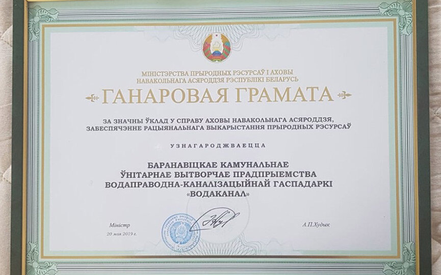 Грамотой награждено Барановичское коммунальное унитарное производственное предприятие водопроводно-канализационного хозяйства «Водоканал». Высокая награда Министерства природных ресурсов и охраны окружающей среды Республики Беларусь вручена предприятию за большой вклад в дело охраны окружающей среды, обеспечение рационального использования природных ресурсов. Ирина СОСНИНА