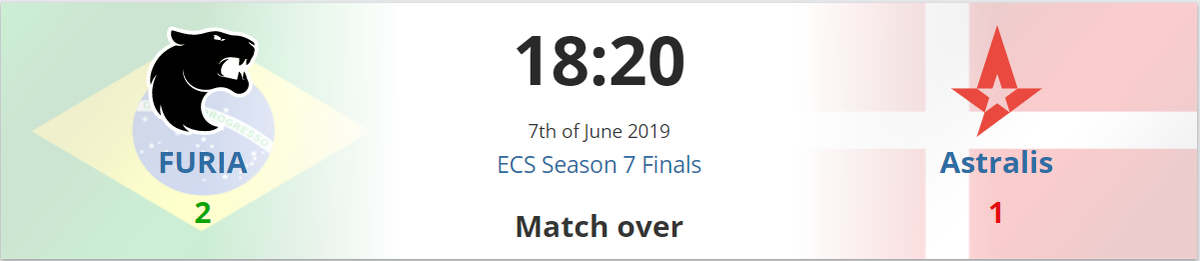 Прошедшим вечером, 07.06.2019 прошел матч между Датской командой Astralis и Бразильцами из FURIA. Матч был очень зрелищным, команды сыграли полноценный bo3 матч на следующих картах: выбор Astralis -Inferno; итог 16-12 в пользу Датчан выбор Furia - Mirage; итог 16-10 в пользу Бразильцев и третьей картой стал Nuke- карта, на которой Датчане одерживали первенство в течении одного года. Итогом третей карты стал результат 16-13 в пользу Бразильцев. Многие комментаторы и pro-игроки были мягко удивлены подобным исходом матча. Букмекерские конторы и аналитики считали Astralis ярыми фаворитами, но Датчане показали не лучший результат. Многие комментаторы отметили отсутствие новых раундов и тактик у Astralis, и ,скорее всего, это и привело к столь горькому поражению в данном противостоянии. Будем надеяться, что к предстоящему мажору, Датчане наберут прежнюю форму и покажут свой истинный потенциал.