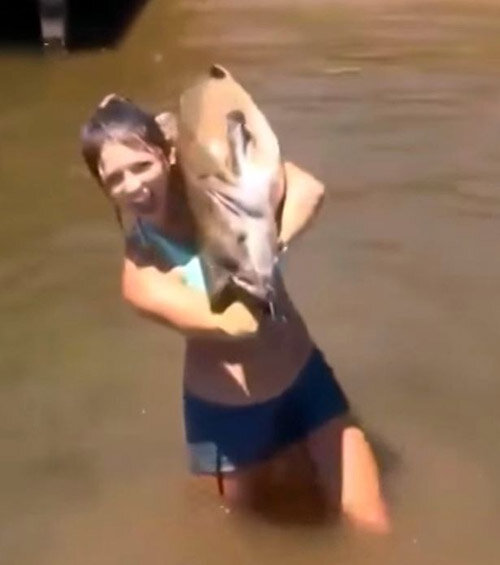Девушка решила порыбачить довольно странным способом, используя вместо снастей и наживки собственную руку. Необычный видеоролик был снят в США, хотя точное место действия неизвестно. На первый взгляд кажется, что девушка с парнем просто купались, но вдруг она с головой нырнула в мутную воду. Через несколько секунд рыбачка с весёлым криком показывается на поверхности с большой рыбиной, почти полностью заглотившей её руку. Впрочем, храбрая девушка отнюдь не была напугана этим фактом, с гордостью продемонстрировав своему парню богатый улов. Ссылка на видео https://www.youtube.com/watch?v=jdqbLMtlLjM