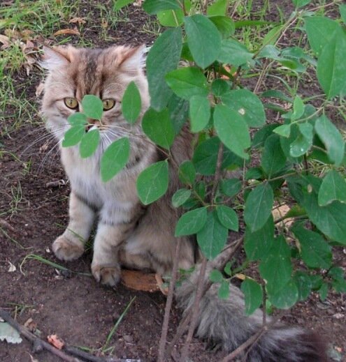 А другая кошка - Нюша - оказалась такой хитрой! Днем кошек в дом не пускали, а Нюша все норовила прорваться, чтобы перехватить кусочек. И вот слышу за дверь пронзительный мяв Малышки – она так вопила, что до костей пробирало! Открываю дверь – сидят Малышка и Нюша, маленькая замолчала, потерлась о мои ноги и убежала на улицу, а Нюша жалистно на меня смотрит – ну, что оставалось делать! Пришлось тайно накормить. Вот как эта хитрюга уговорила мелкую на такую эскападу?