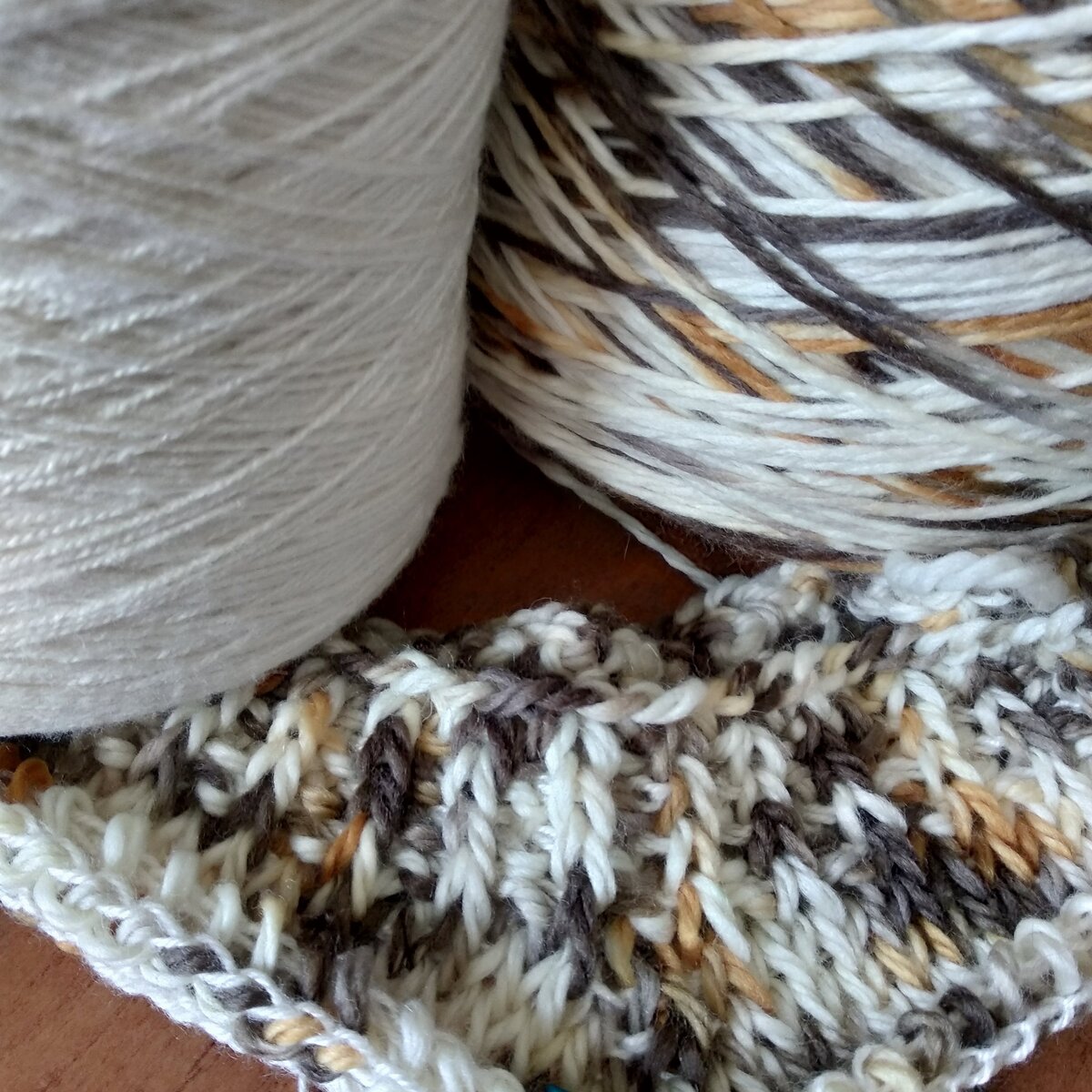 Решила вязать тунисским крючком (да-да, это крючок, а не спицы), потому что пряжа толстенькая и, хотя у меня ее много -чтобы уж точно хватило - я вяжу обратный ряд мягчайшей пряжей (на фото белая) - кукуруза с молоком.