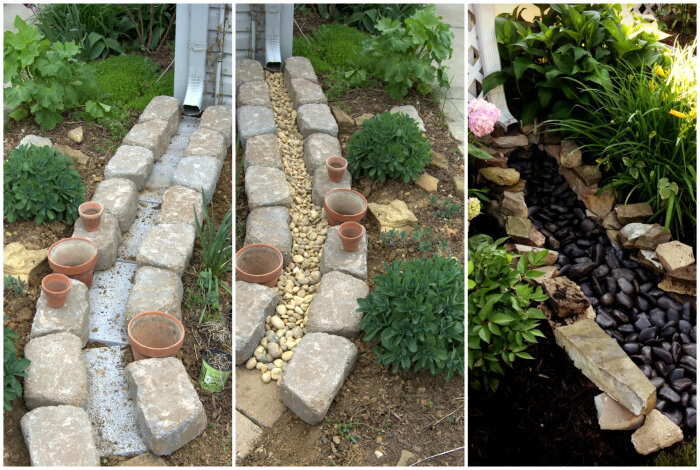 Опытный хозяин знает, что любые монтажные элементы можно замаскировать так, что они не просто пропадут из поля зрения, но и станут настоящим украшением дома. Так и самую обычную трубу водостока можно превратить в декорированный предмет экстерьера. Хочу поделиться с вами идеями оригинальных водостоков, которые прекрасно с этим справились Сухой ручей Это самая популярная, но при этом самая интересная идея декорирования. Сухой ручей представляет собой имитацию небольшой речки. От водостока высыпается дорожка из песка, или крупного камня, в направлении будущего ручейка. Затем по бокам уже усыпанного водоема располагаются объемные камни, а на дно высыпаются мелкие, например галька, или гравий. Лучше использовать разноцветные камушки, что будет смотреться еще более оригинально и хорошо сочетаться с цветами в саду. В дождливую погоду подобная конструкция наполняется водой и становиться настоящим ручейком, но и в засушливую погоду не станет терять свой вид и будет просто казаться, что ваш водо