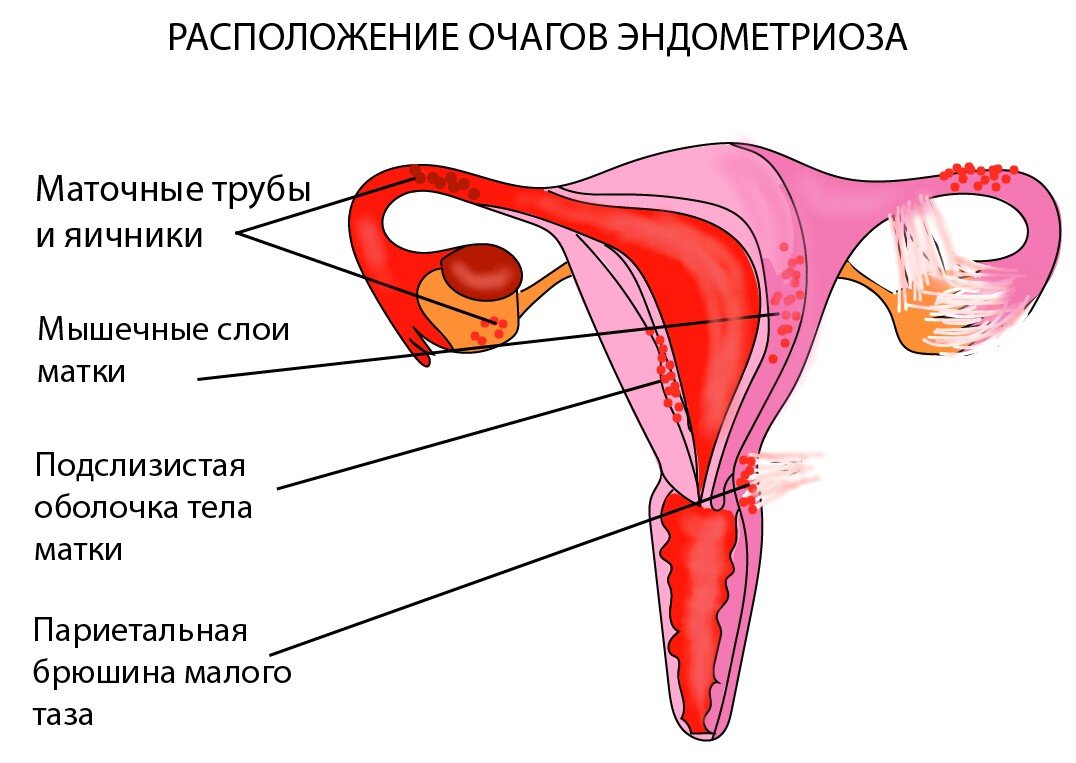 При развитии эндометриоза в тканях появляются клетки, похожие на клетки слизистого слоя матки. Они располагаются не там, где нужно — за пределами полости детородного органа. Такие клетки называют гетеротопиями. Их можно встретить в яичниках и маточных трубах, кишечнике и мочевом пузыре, иногда на коже. Без лечения эндометриоз неизбежно прогрессирует, становится причиной постоянной боли и ведет к бесплодию.