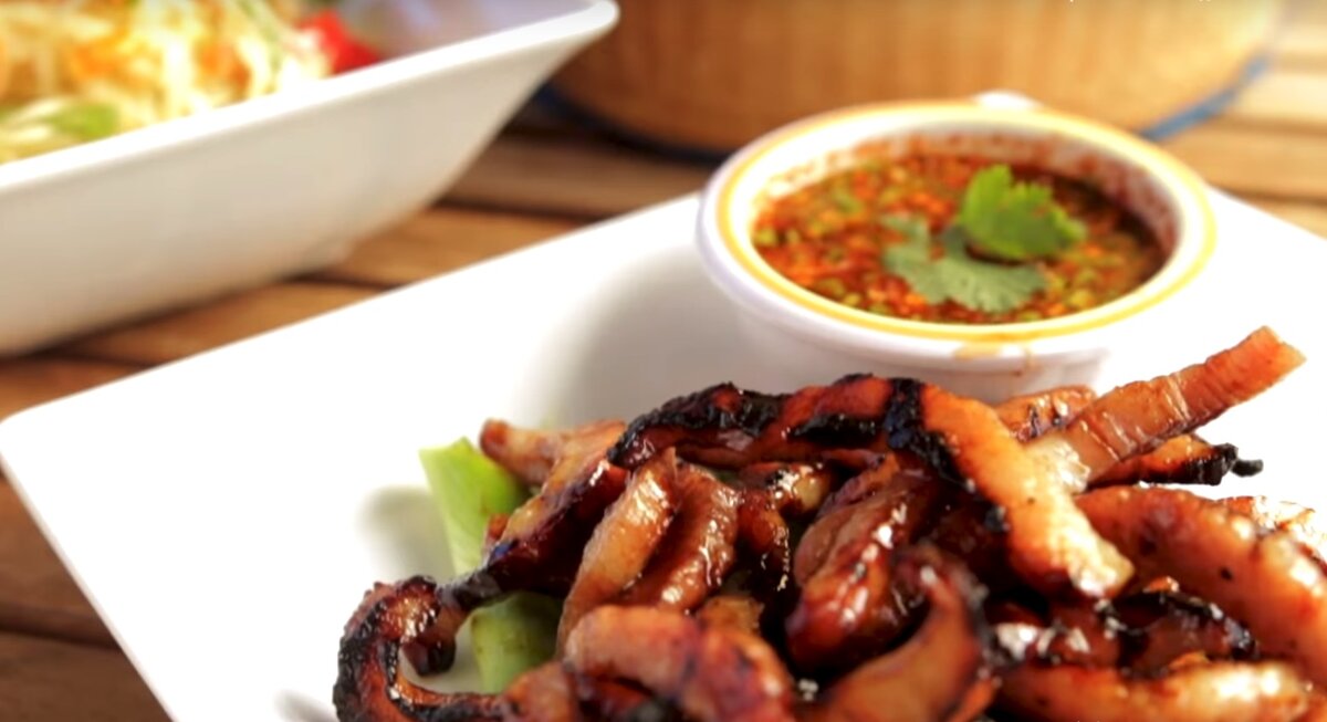 ПОДПИСАТЬСЯ НА КАНАЛ Время подготовки: 8 минут Время приготовления: 4 минуты Общее время: 12 минут Количество порции: 2 Автор: Jen Phanomrat Состав продукта · Пол кило свиной шеи, нарезанный тонкими ломтиками · 1 столовая ложка рыбного соуса · 1 ½ столовой ложки пальмового сахара Для пикантного соуса: · 1 лук-шалот, тонко нарезанный · 2 столовые ложки измельченной кинзы · 2 чайные ложки молотого перца чили · 1 столовая ложка молотого жареного сырой риса · 2 столовые ложки рыбного соуса · 1 столовая ложка пальмового сахара · сок 2-х лаймов Рецепт: 1. Замариновать свиную шейку в рыбном соусе и пальмовым сахаром примерно на 20-20 минут. Вынуть из маринада и жарить на среднем огне около 2-3 минут, переворачивая по мере готовности. 2. Смешайте все ингредиенты для пикантного соуса и подавайте с липким рисом! Вам понравилась статья? Ставьте палец вверх и подписывайтесь ! Благодарю за внимание! ПОДПИСАТЬСЯ НА КАНАЛ