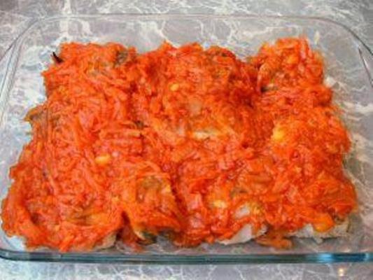 Ингредиенты: минтай – 0,7 кг; лук – 1 шт.; морковь – 1 шт.; мука растительное масло томатная паста – 20 мл; вода –1 стакан; сахар – 5 г; соль – щепотка; черный перец – щепотка; душистый перец – 4 горошинки; лавровый лист – 1 шт.; столовый уксус 6%– 10 мл. Заходите на мой сайт и читайте ещё больше новых рецептов и советов Способ приготовления: Минтая почистить, порезать кусочками небольшого размера. Посолить, поперчить и обвалять в муке. На растительном масле обжарить рыбу с двух сторон до румяной корочки. Лук и морковь почистить. Порезать луковицы полукольцами, морковь натереть на крупной терке. Отдельно жарить луково-морковную смесь до золотистого цвета. В миске смешать томатную пасту и воду. Влить томатную смесь к обжаренным овощам. Добавить сахар и специи, перемешать и тушить маринад на умеренном огне 5 минут. Снять с огня, влить уксус и перемешать. В глубокую миску выкладывать слоями рыбу и маринад. Убрать в холодильник на 3 часа. Приятного Аппетита! Подпис
