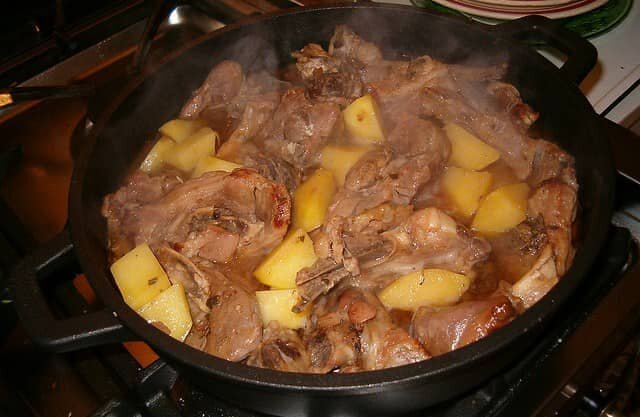 Очень нежное и сочное мясо для ужина с гарниром в духовке можно приготовить по данному рецепту. ИНГРЕДИЕНТЫ Заходите на мой сайт и читайте ещё больше новых рецептов и советов РЕЦЕПТ ПРИГОТОВЛЕНИЯ Чеснок почистить и порезать пластинками. Мясо промыть, обсушить бумажными полотенцами, нарезать крупными кусками и нашпиговать чесноком. Натереть мясо со всех сторон соль. перцем и специями. Оставить на 1 час в прохладном месте. На раскаленной сковороде с растительным маслом обжарить с двух сторон до румяной корочки. Лук почистить и порезать крупными кусками. Добавить лук с мясу и обжарить ещё несколько минут, чтобы лук слегка подрумянился на среднем огне. Затем добавить воду или бульон, посолить и поперчить, по вкусу. Довести до кипения и тушить на медленном огне под закрытой крышкой 1 час. В это время картошку почистить и порезать крупными кусками и отправляем к мясу, добавляем при необходимости еще немного воды и варим под закрытой крышкой 20 минут. Затем снять с огня и дать постоять